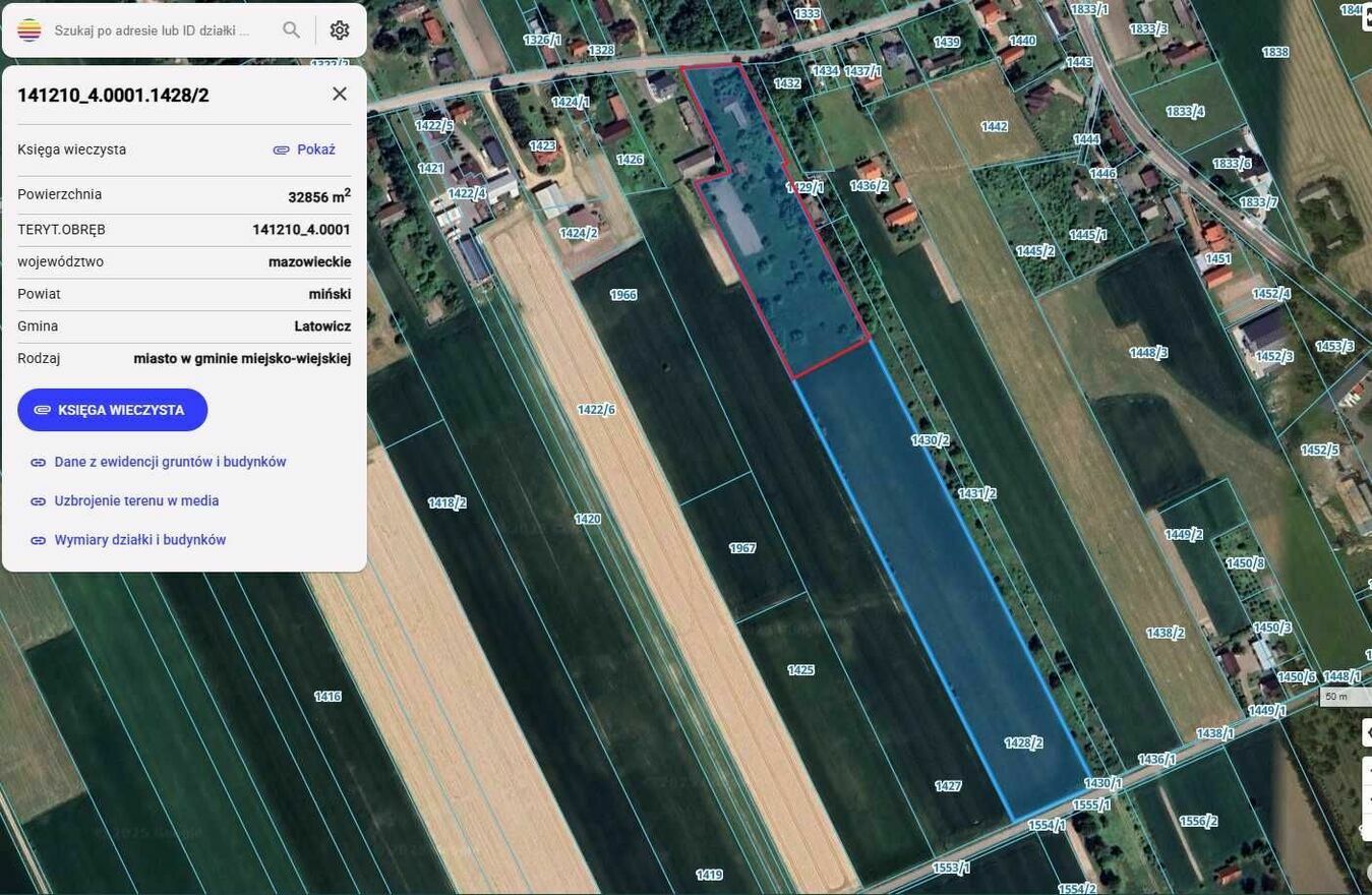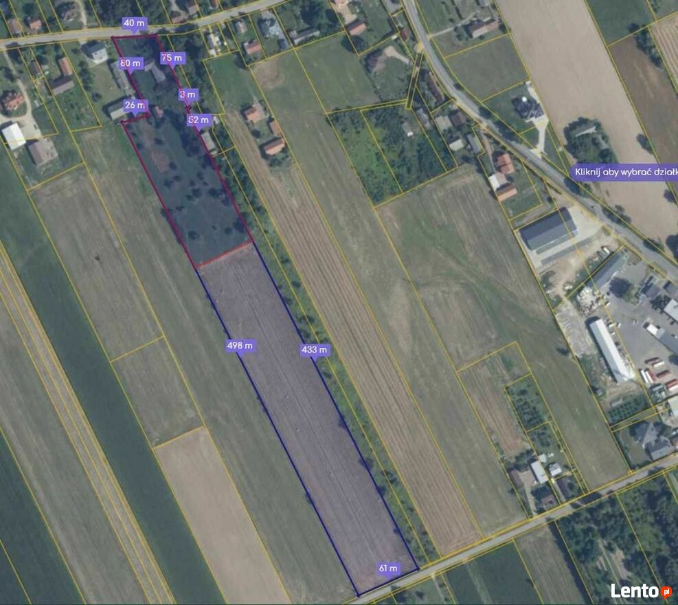 Działka siedliskowa przeznaczona pod zabudowę jednorodzinną z sadem o łącznej powierzchni ok 1,19 ha. Jest to część działki nr: 1428/2, będącej aktualnie w trakcie podziału na 2 części zgodnie z załączonymi zdjęciami. W bliskim sąsiedztwie znajdują się domy jednorodzinne. Do działki przyłączone prąd i telekomunikacja. W drodze kompletne uzbrojenie: gaz, woda, kanalizacja.Dzięki długości działki można ją wykorzystać do uprawiania ogródka, stworzenia sadu lub prowadzenia innych prac rolniczych.